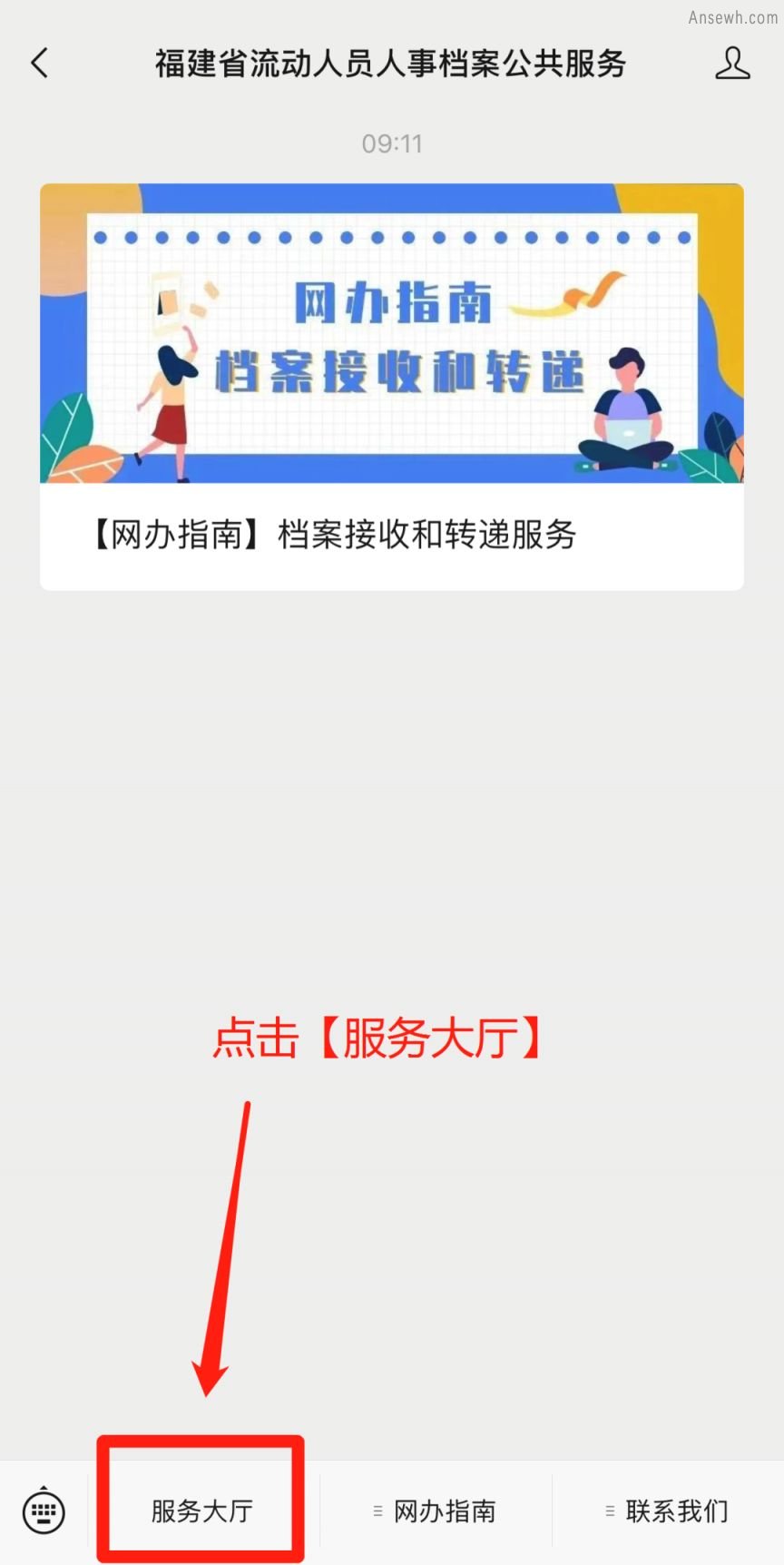 3. 微信公众号-【福建省流动人员人事档案公共服务】——【服务大厅】——【档案机构查询】;