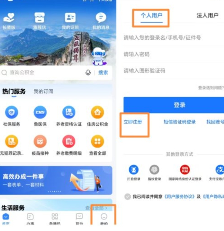 操作流程:登录“爱山东”app——点击“我的”——“个人用户”,首次登录需要“立即注册”——注册后可以选择一种方式登录。