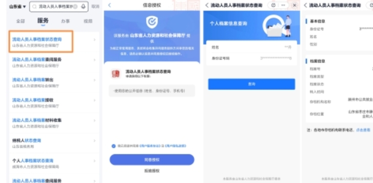 操作流程:输入“流动人员人事档案状态查询”搜索,找到服务“流动人员人事档案状态查询(山东省人力资源和社会保障厅)”点开——信息授权,同意授权——个人档案信息查询,点击“查询”,会显示档案状态。