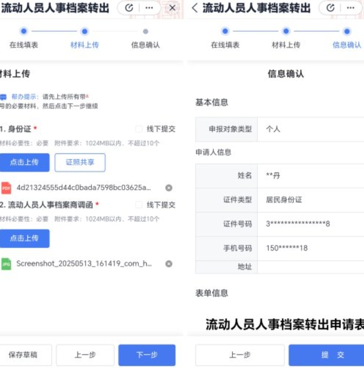 操作流程:输入“流动人员人事档案接收”搜索,找到服务“流动人员人事档案接收(山东省人力资源和社会保障厅)”点开——点击“在线办理”——用户须知,勾选同意此协议,点击同意并继续——授权确认,点击“下一步”——智能导办,区划选择“山东省/枣庄市/滕州市”,“单位存档”选择“否”,点击“下一步”——在线填表,基本信息,点击“下一步”——带*为必填项,“存档类型”为“个人存档”,“原档案保管机构名称”需为有存档权限的档案存放机构名称,“接收档案机构名称”为“滕州市公共就业和人才服务中心”,点击“下一步”——材料上传,身份证,点击“下一步”——信息确认,点击“提交”。