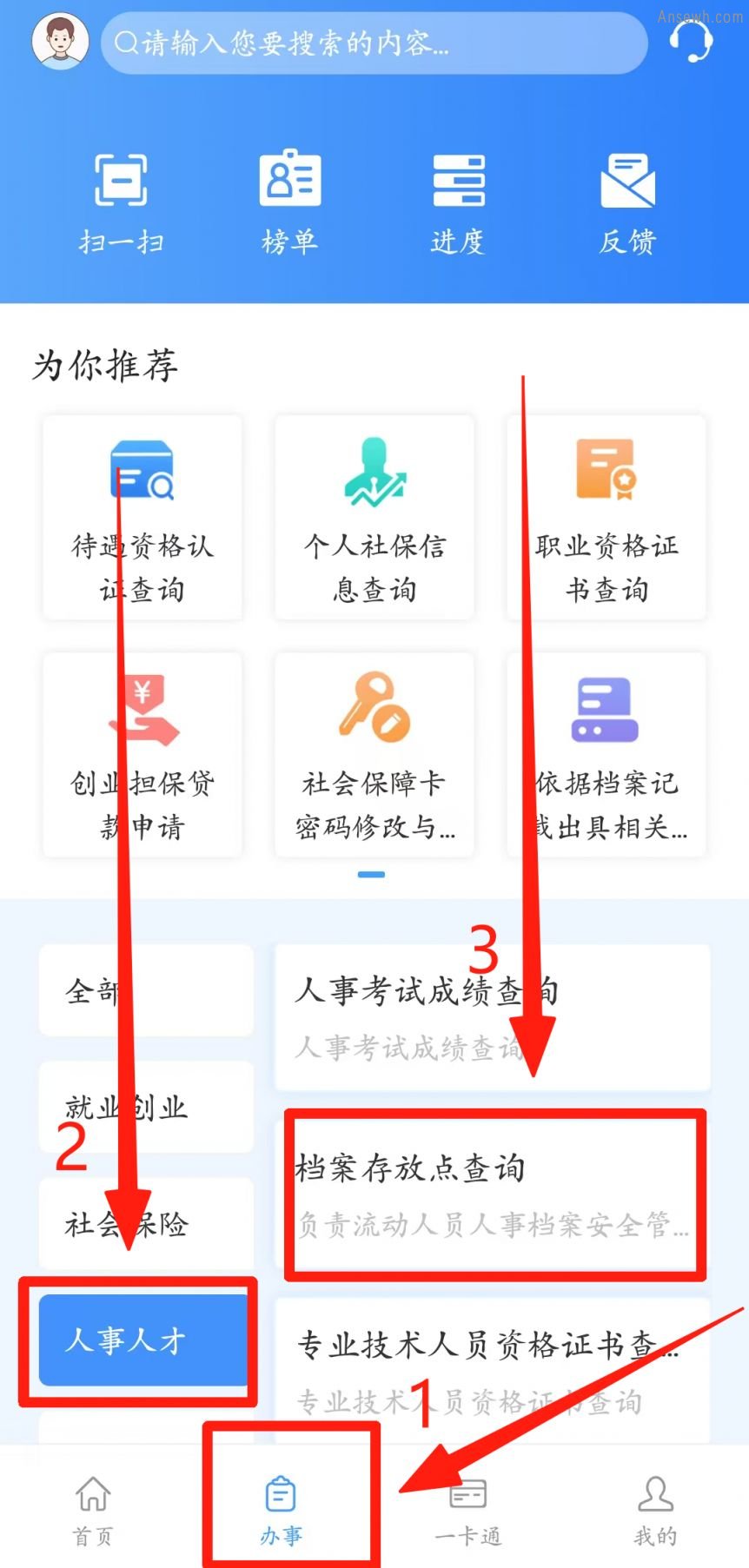 登陆后,点击底部【办事】,在【人事人才】板块中找到并点击【档案存放点查询】,即可查询。