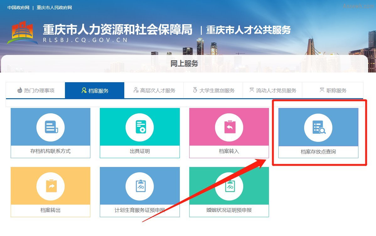 2.进入网页后,在此点击“档案存放点查询”即可进入重庆档案查询页面;