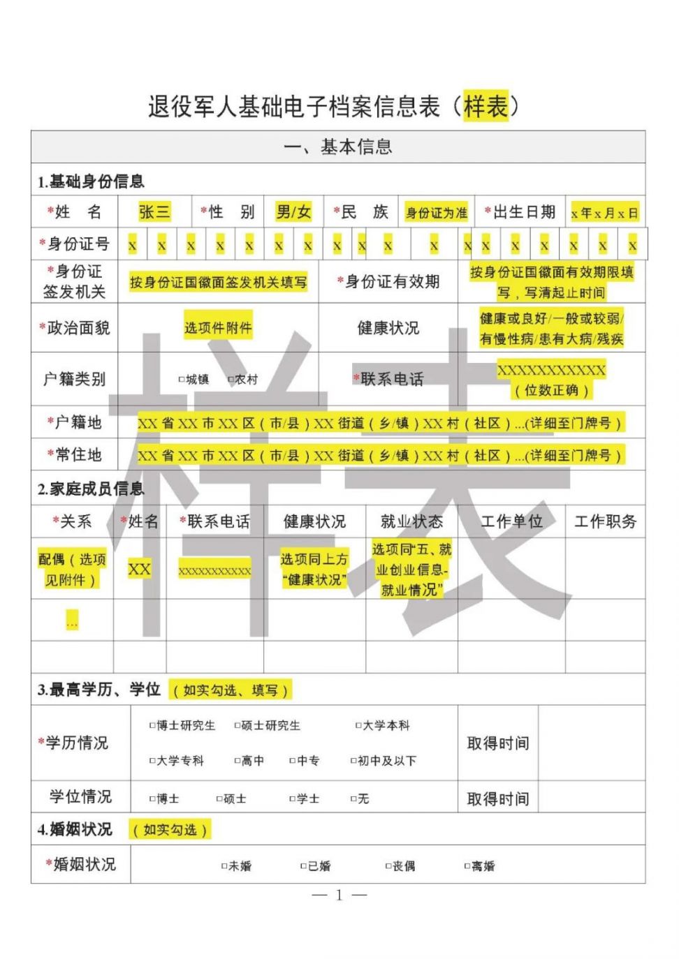 一、退役军人,请您下载填写《退役军人基础电子档案信息表》;其他优抚对象,请您下载填写《其他优抚对象基础电子档案信息表》;同时为退役军人和其他优抚对象的,请您下载填写《退役军人基础电子档案信息表》。填写信息表时,您可参照我们为您绘制的《退役军人基础电子档案信息表样表》或《其他优抚对象基础电子档案信息表样表》(附后)。