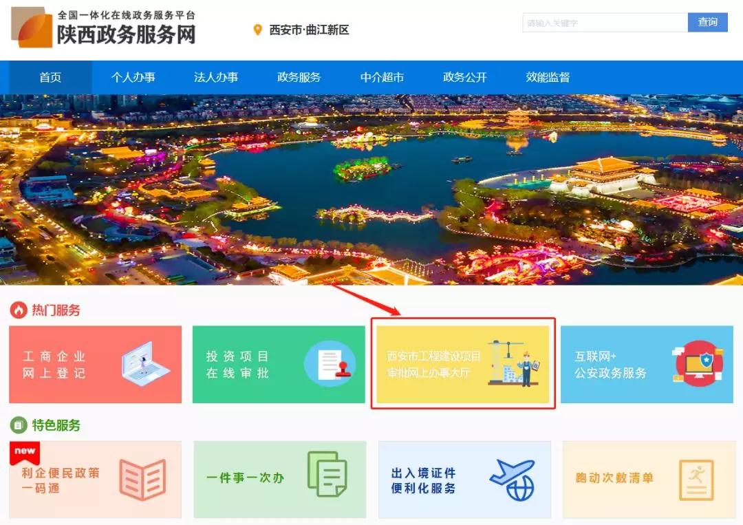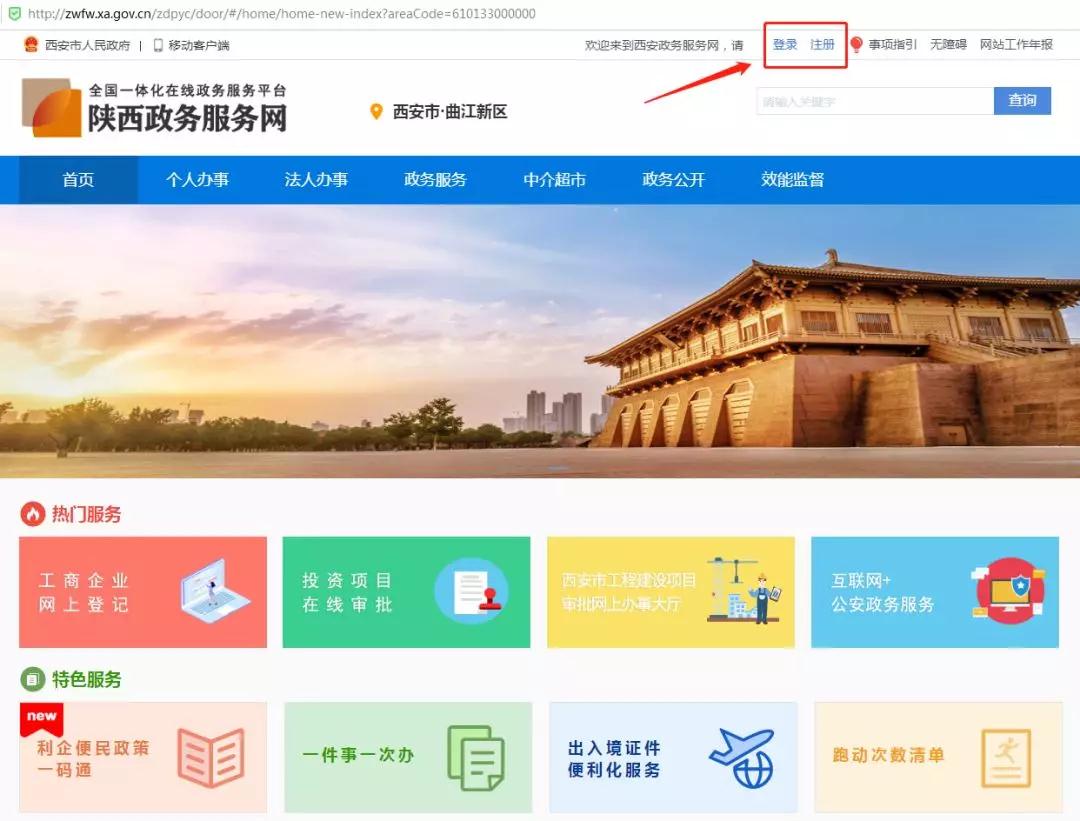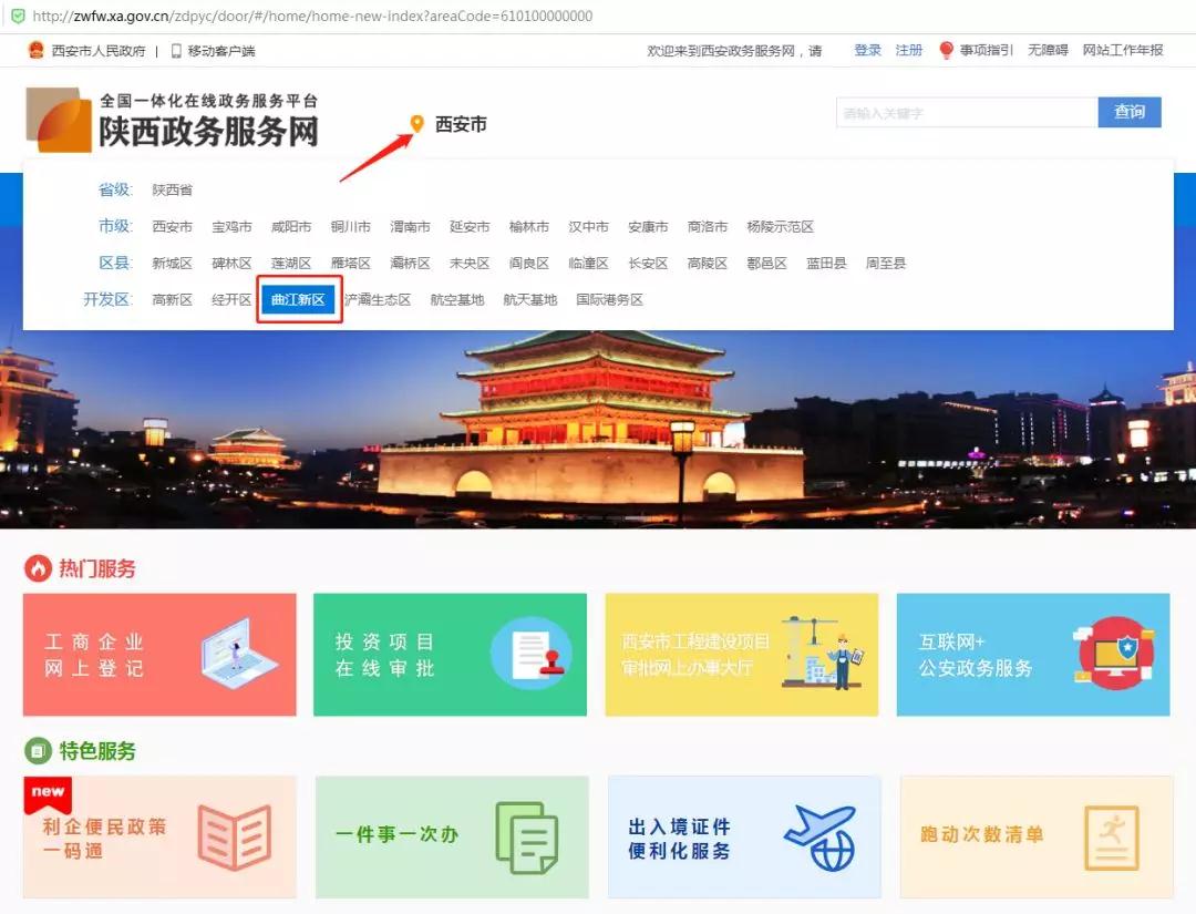 1.请您登录“陕西政务服务网”官网(http://zwfw.xa.gov.cn/)首页,选择进入“西安市曲江新区”站点。