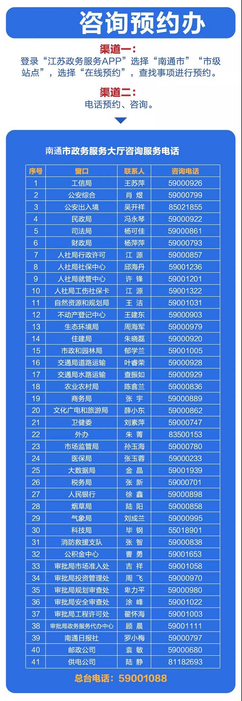 三、为最大程度避免人员聚集,提倡和鼓励通过“网上办、预约办、代帮办、自助办”等方式办理各类事项,可通过“江苏政务服务网”南通旗舰店、“江苏政务服务”APP、“南通百通”APP进行线上咨询、在线办理。