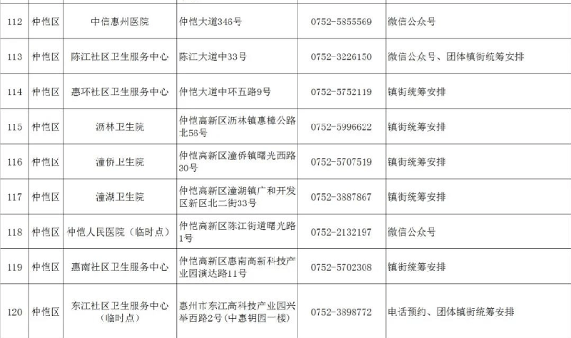 惠州市仲恺高新区新冠病毒疫苗接种点信息