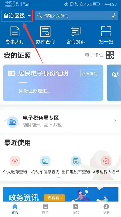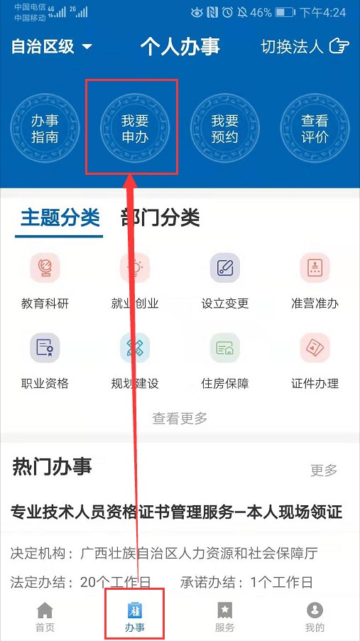 第四步:在“首页”搜索对应事项或者点击下方“办事”菜单查询办事指南进行申报。