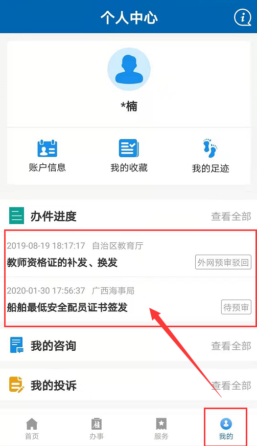第五步:点击右上角的姓名或法人名称进入个人中心查询办件进度,注意选择办事所属地市。