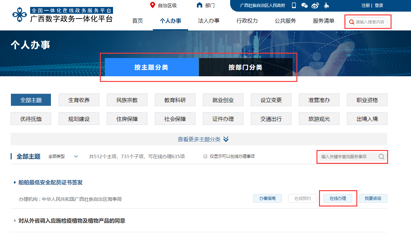 您可以通过事项类型,事项主题分类等方式快速锁定事项,也可以通过关键词快速检索。