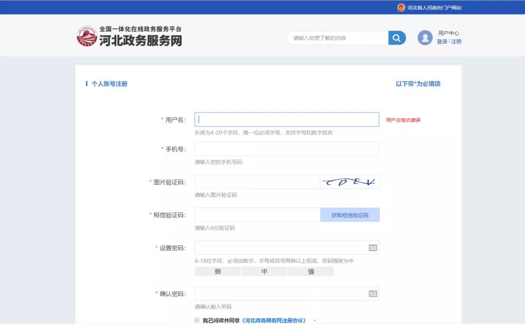 进入“河北政务服务网”主页面,在右上角选择“个人或是企业”注册登录,目前登录方式有三种,手机号注册登录;支付宝登录;身份证号登录。