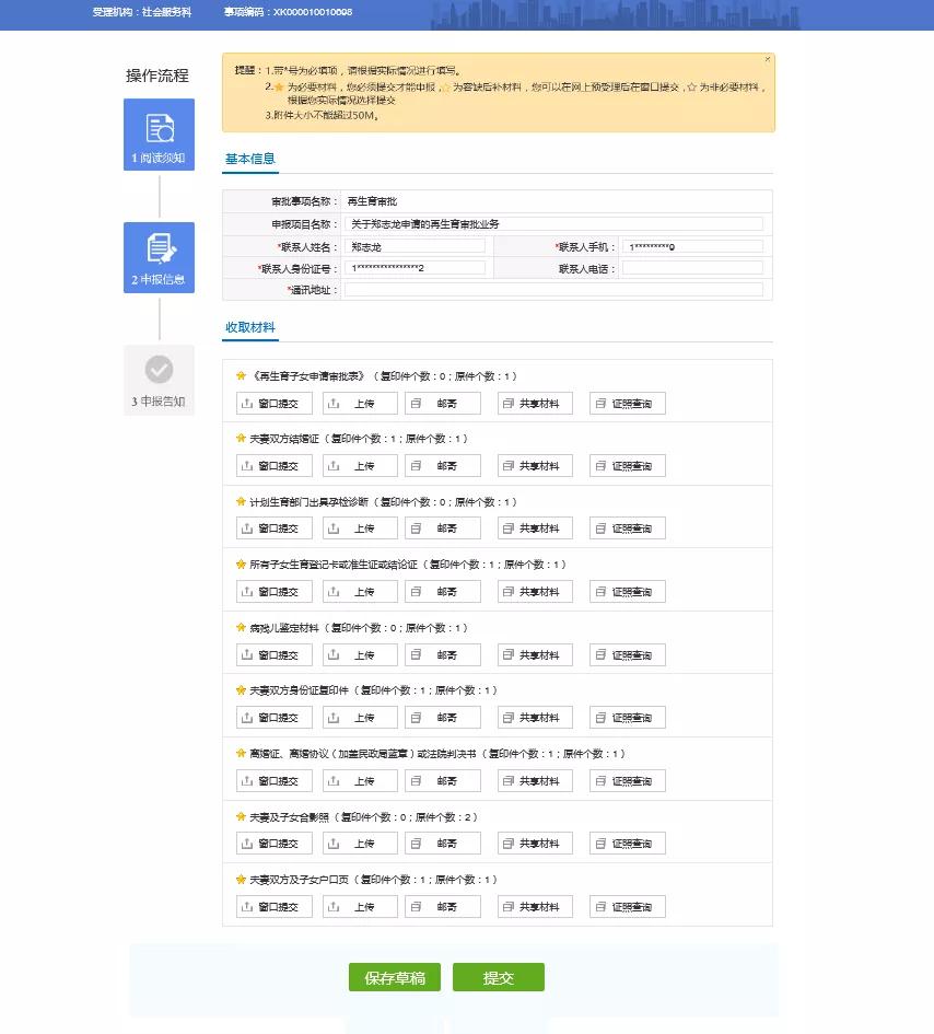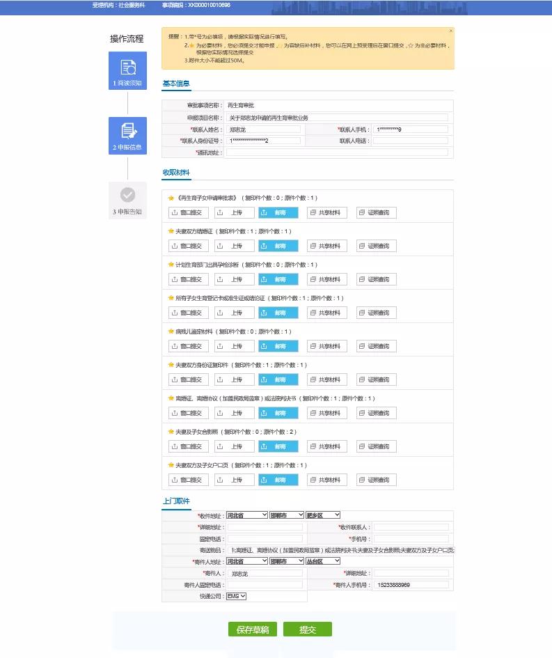 准备好相关材料后,选择“在线办理”,弹出界面,在“审批条件”下选择“全选”,点击提交;完善个人信息,点击每一项申报材料的“上传”按钮,全部上传完毕后,点击提交,即可进入预审核阶段。
