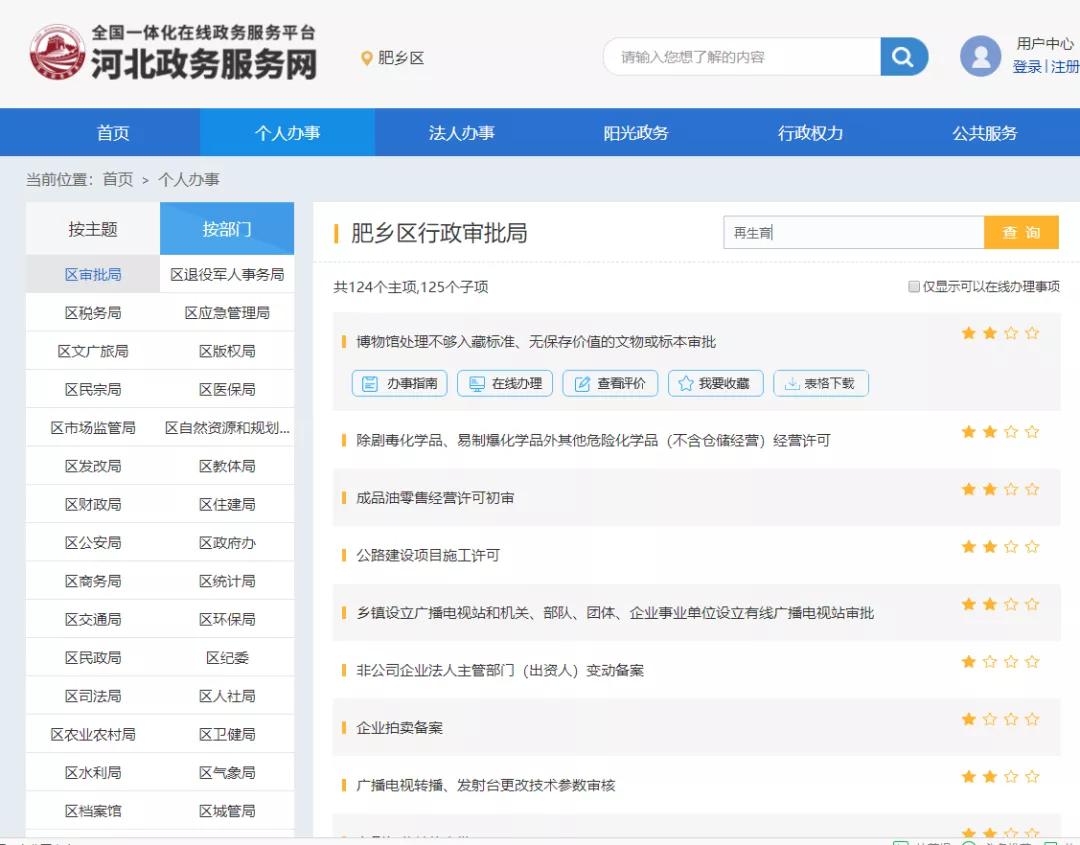 办事群众百度搜索“河北政务服务网”,点击登录,选择相应的市区县,邯郸市--肥乡区。