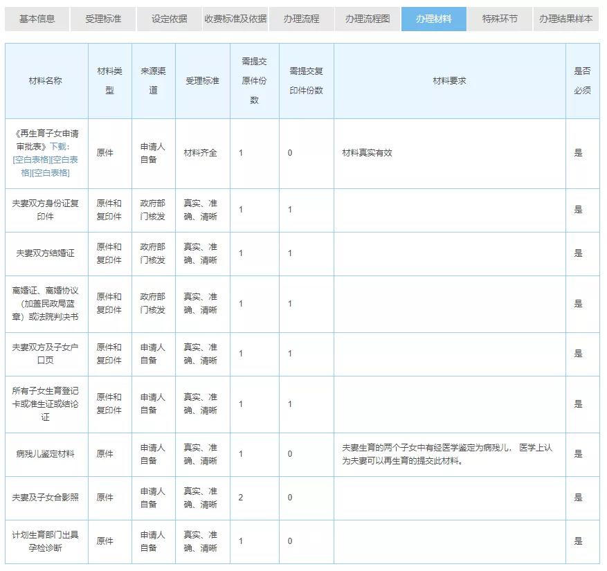 在“查找服务事项”中可事先搜索需要办理事项,提前了解相关信息,例如办理再生育,可先搜索“再生育”等相关字样找到该服务事项,浏览相关信息,如办理流程、办理材料等,还可在办理材料中下载空白表格、示范表格,根据示范表格准备相关材料。