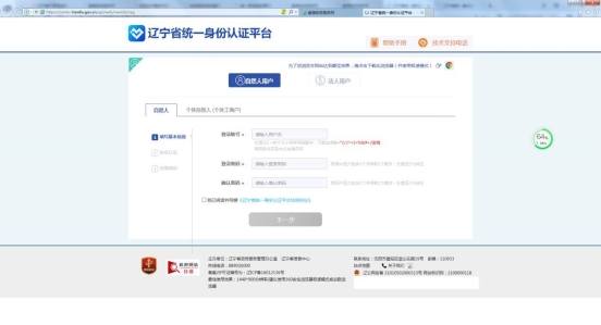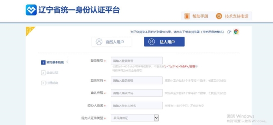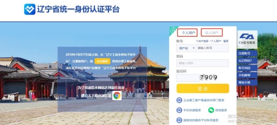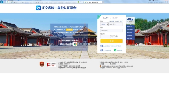 进入辽宁省统一身份认证平台,默认登录是个人用户,此时需要选择法人用户,填写登录账号、密码和验证码信息进行登录。