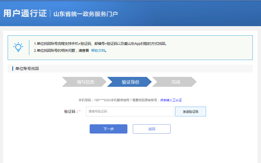 注意:单位账号找回只能找回单位账号(即法人账号),管理员和经办人的账号需要单位账号登录后在单位空间中查看。