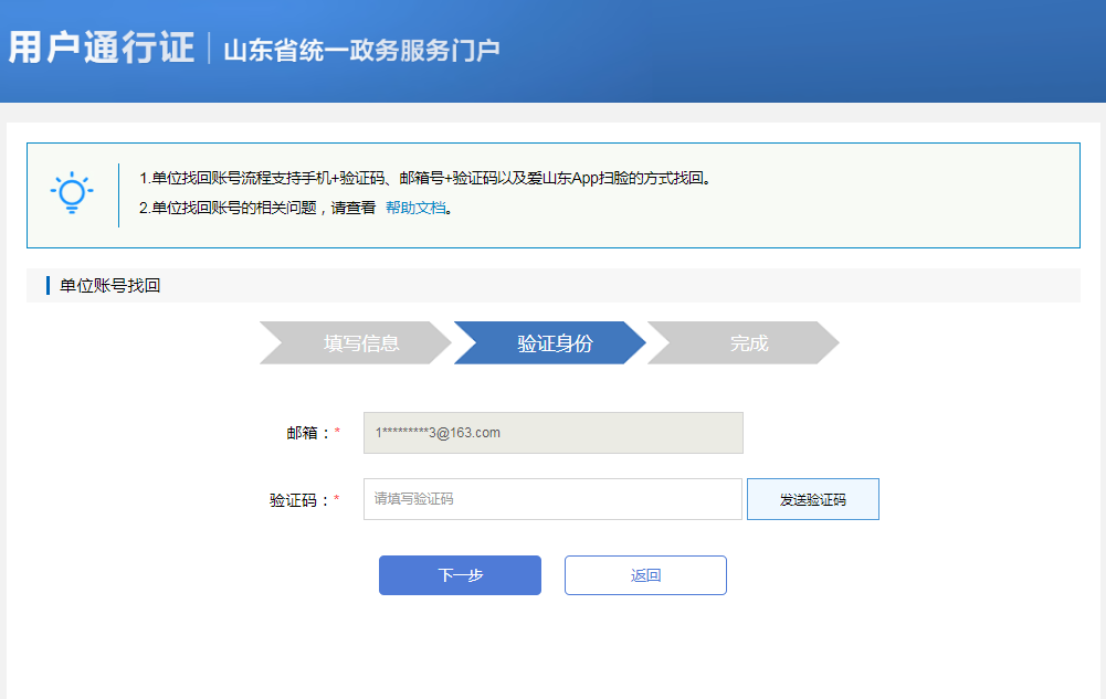 验证身份环节涉及到三种验证方式:手机号 验证码方式、邮箱 验证码方式、爱山东APP扫脸认证。
