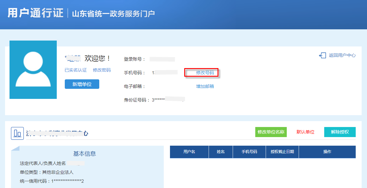 单位用户在山东政务服务网注册过单位账号,忘记单位账号绑定的手机号或手机号已停用,可在浏览器中输入山东政府服务网地址http://www.shandong.gov.cn/col/col94091/,打开网站后将鼠标放到页面右上角“登录”按钮上弹出“个人登录”和“单位登录”后,点击“单位登录”,登录政务服网后点击右上角的姓名可以进入“用户中心”(图1),在 “用户中心”中点击“单位空间”,进入单位空间(图2)后可查看以及变更手机号。如果忘记账号密码,在单位登录界面,点击页面上的“忘记账号”进行找回账号,再点“忘记密码”找回密码。