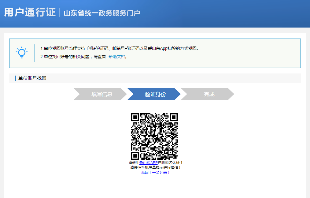 第三种验证方式,通过“爱山东APP扫脸认证”进行验证,点击“立刻验证”,跳转到如下界面,打开“爱山东”APP点击首页上部的“扫一扫”功能实现扫脸验证。