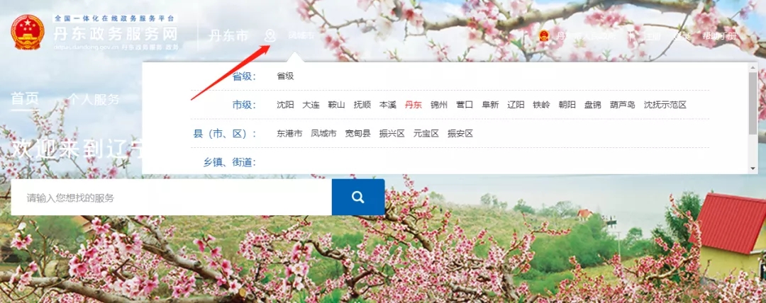 1、点击首页上的区域切换,选择办理事项所在的区域为凤城,如下图: