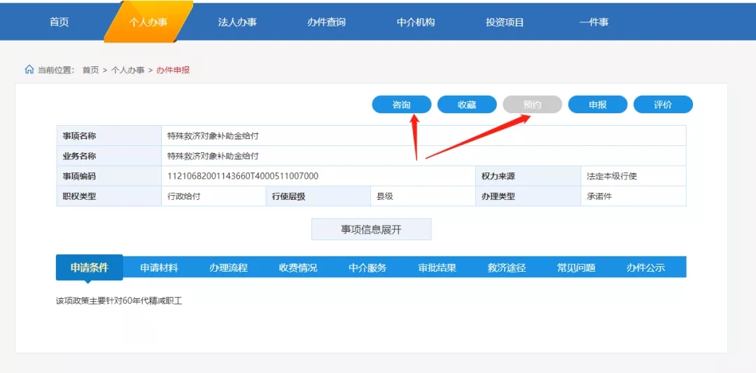 7、点击事项的【咨询】、【预约】按钮可以提前进行事项办理的问询和预约,如下图: