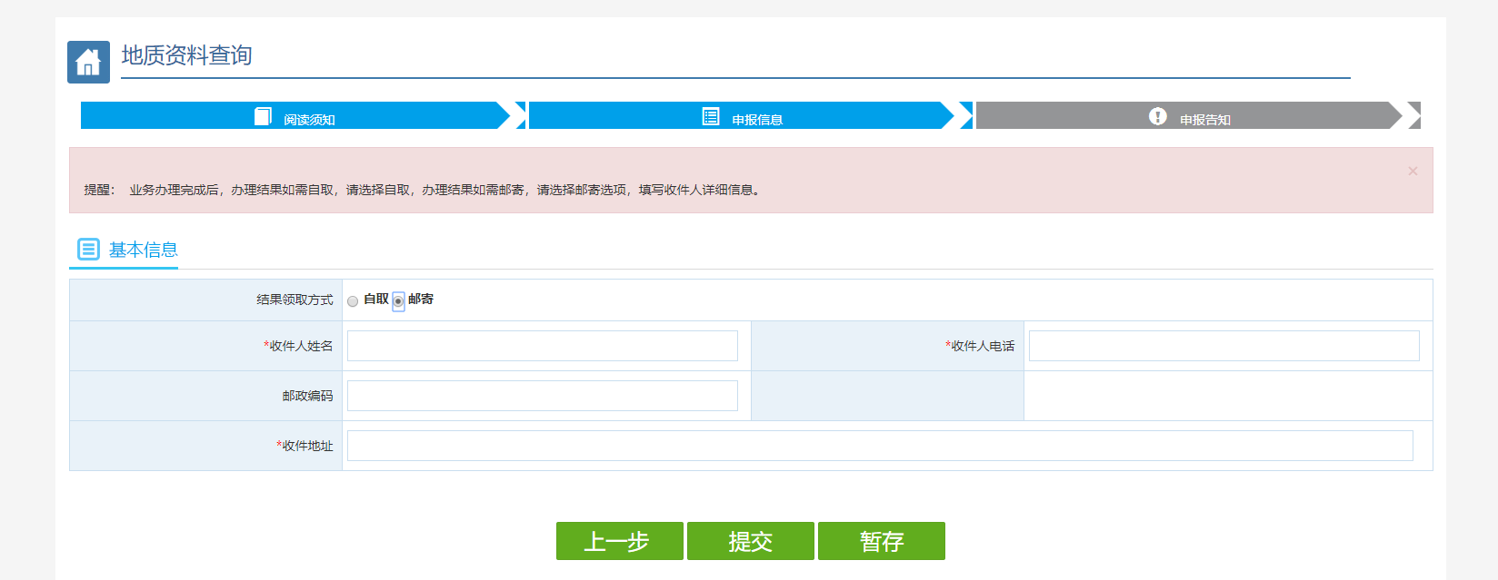 6.结果领取方式共有两种,分别是自取和邮寄,选择“邮寄”时需要输入收件人的收件信息,无误后点击“提交”,然后点击“确定”。