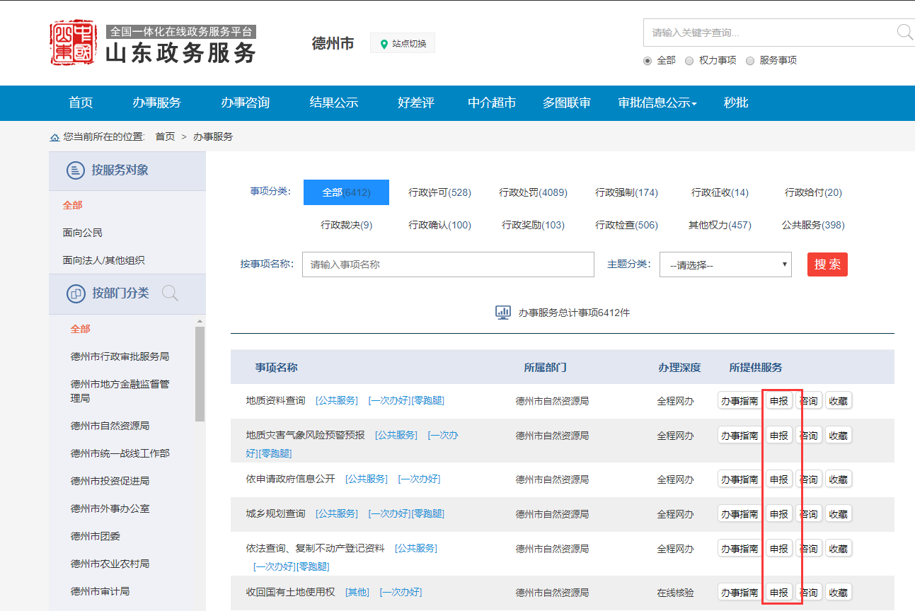 全国档案查询公共就业和人才服务中心1.登录德州政务服务网点击事项右侧的“申报”按钮,开始申报。