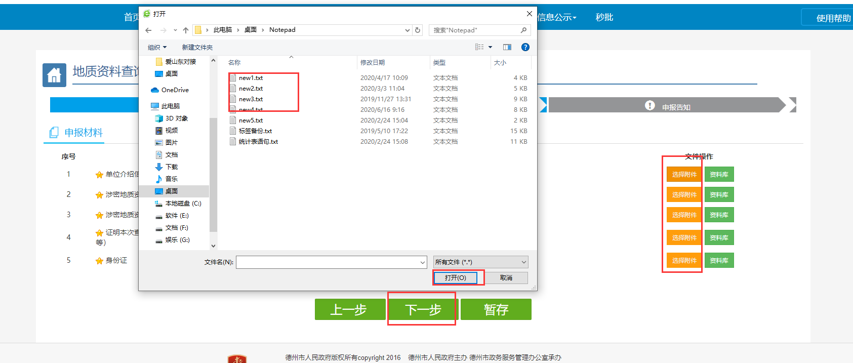 5.在申报材料界面用户既可以上传申请材料的电子版文档。点击材料右侧的“选择附件”按钮,找到电子文档的存档位置,然后上传,上传完毕以后,点击“下一步”。
