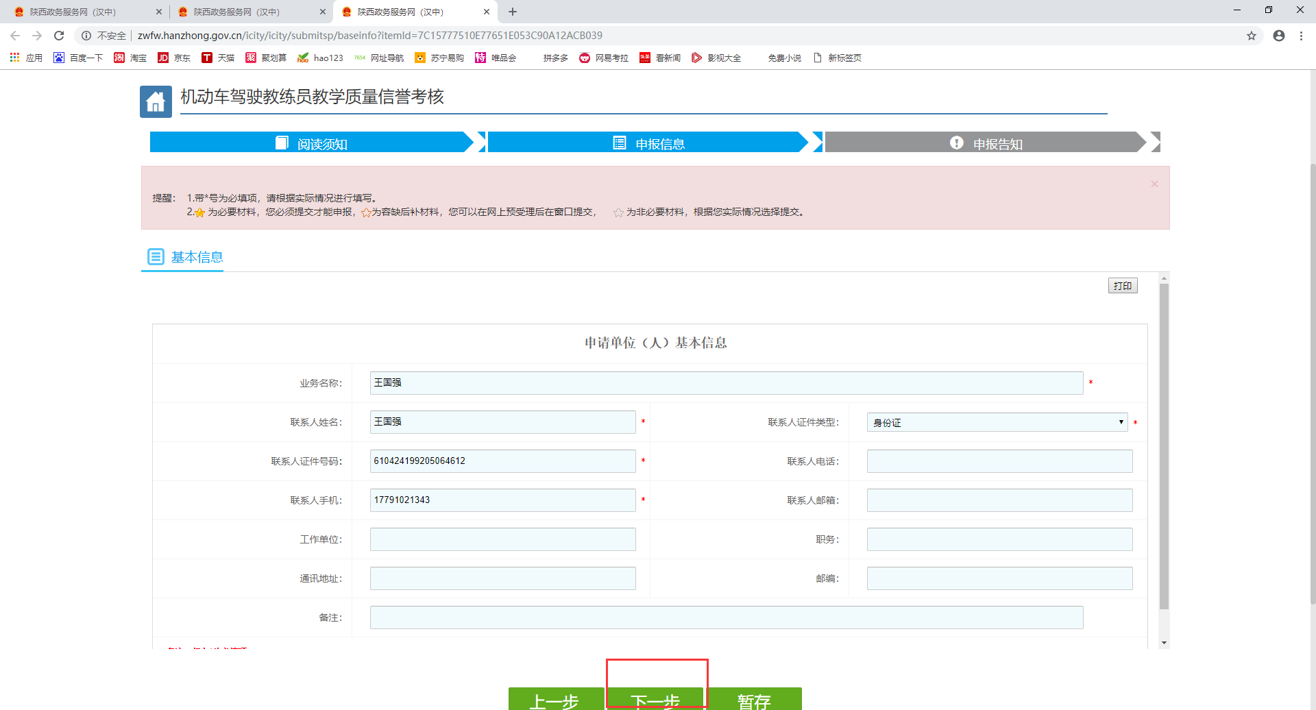 9.申报信息,填写基本信息(注册账号时填写的信息会自动填充),如需修改,可直接进行修改,填写完毕点击下一步。注意:带*为必填项。