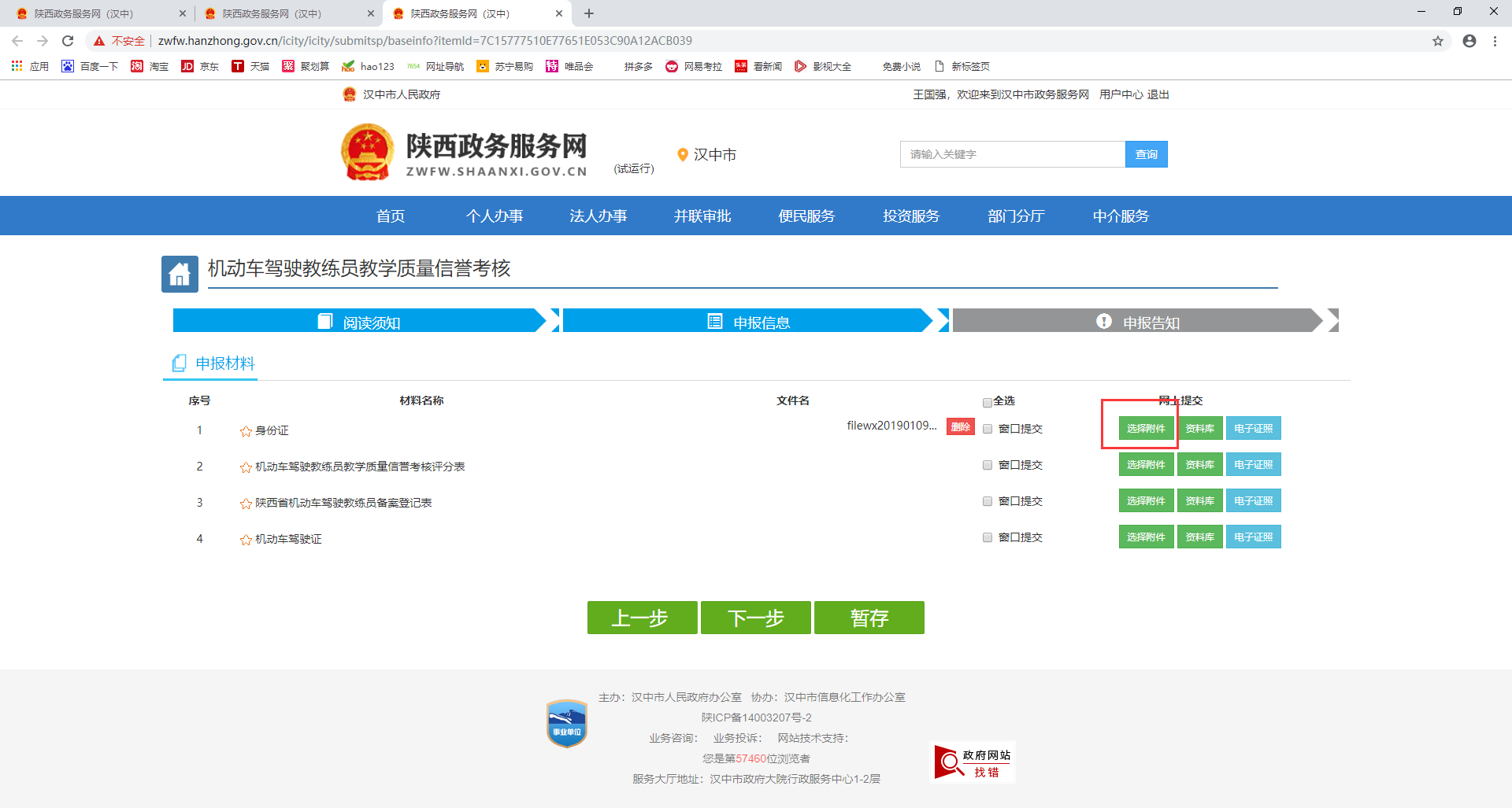 11.上传申报材料,带*的材料为必要材料,材料可以点击“选择附件”从本地上传,也可点击“资料库”选择当前账户之前上传过的电子材料,还可从“电子证照”中选择汉中服务网申报产生的证照信息。