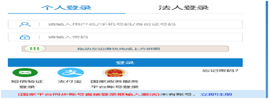 2、输入“账号”、“密码”登录。也可以选择“短信验证登录”“支付宝”“国家政务服务平台账号登录”。