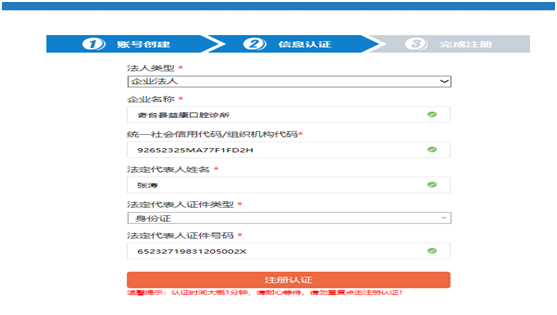 2、填写法人类型、企业名称、统一社会信用代码、法定代表人姓名、法定代表人证件类型、法定代表人证件号码,单击注册认证。