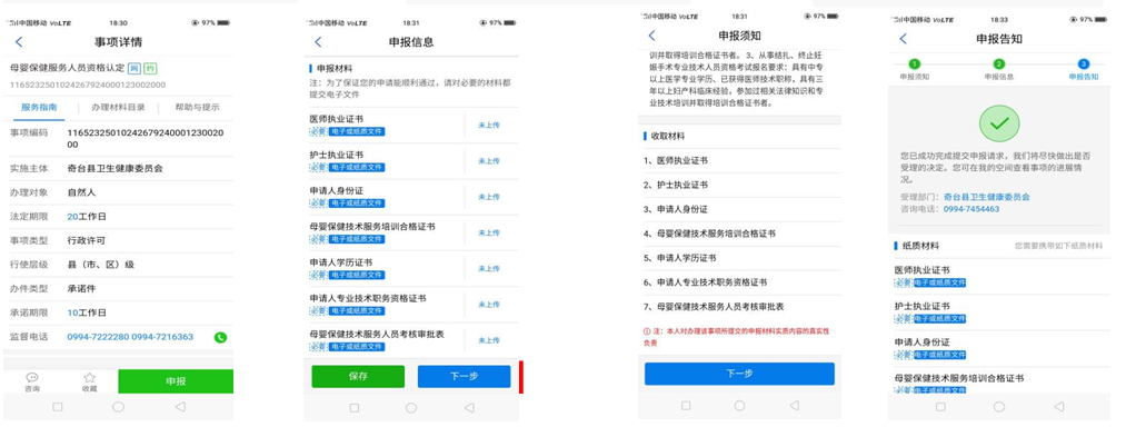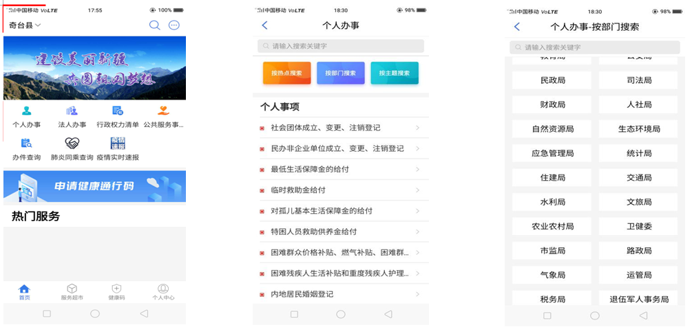 打开新疆政务服务网APP,首页定位选择“奇台县”,选择“个人办事”,“按部门搜索”选择部门,如“卫健委”,选择“申报”上传资料后选择“下一步”,弹出绿色后,表示申报完成。