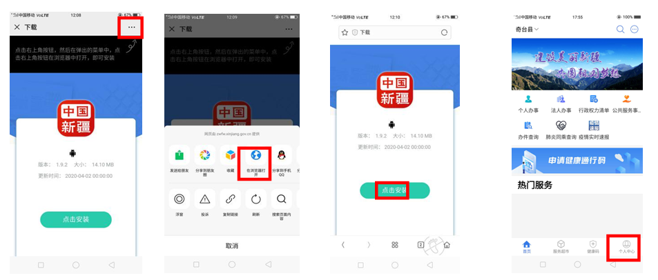 1、手机扫码下载政务服务APP,扫码成功后,点击右上角的三个点,选择“在浏览器打开”,单击安装,安装完成后,直接打开,在首页左上角定位奇台县,再点击“个人中心”,选择“注册”。