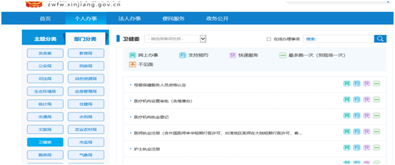3、在新疆政务服务网首页选择“个人办事”或“法人办事”,可以根据“主题分类”或者“部门分类”来快速定位用户需要申报的事项。若事项右侧标有“网”,则表示该事项支持网上申报,点击“申报”即可。页面弹出绿色笑脸表示申报成功。