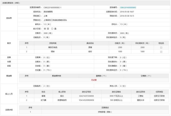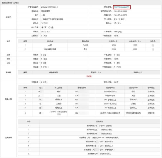 2、详细:出港报告变更提交成功后,点击变更报告列表中的“报告编号”可查看该出港报告变更前的详细内容,点击“变更报告编号”可查看出港报告变更后的详细内容。如下图所示: