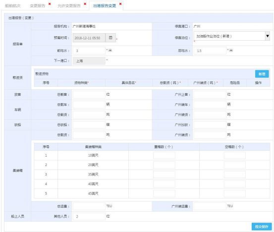 1、变更:点击出港报告的“变更”进入到出港报告变更页面,修改出港报告内容后,点击“提交”按钮即可提交出港报告变更信息。如下图所示: