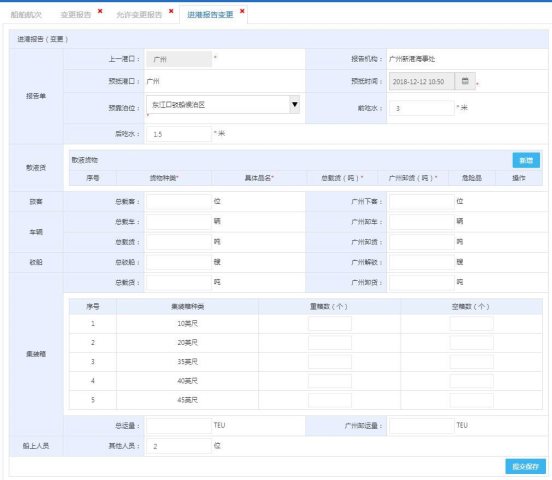 1、变更:点击进港报告的“变更”进入到进港报告变更页面,修改进港报告内容后,点击“提交”按钮即可提交进港报告变更信息。如下图所示: