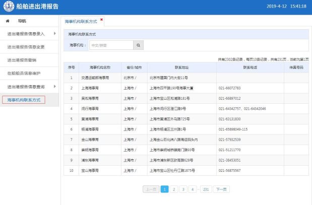 用户登录中国海事综合服务平台-船舶报告系统后,点击左侧导航栏中的“海事机构联系方式”进入到海事机构联系方式页面,输入海事机构名称点击放大镜图标可查询该海事机构的电话信息。如下图所示: