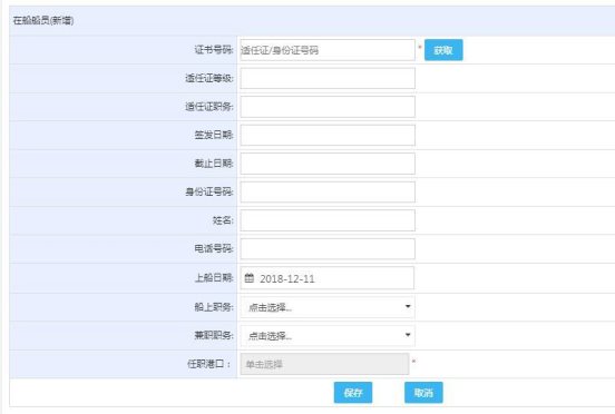 填写证书号码(船员适任证号码或者身份证号码),点击获取按钮,自动获取船员的基本信息(适任证等级,适任证职务,签发日期,截止日期,身份证号码,姓名,电话号码),选择上船日期,船上职务,兼职职务(如有),任职港口后,点击保存即可,如果保存成功,则会弹出成功提示,并跳转至在船船员列表页面。