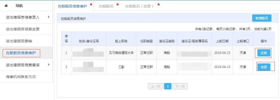 用户登录中国海事综合服务平台-船舶报告系统后,点击左侧导航栏中的“在船船员信息维护”进入到在船船员页面,显示了本船舶现有在船船员信息。如下图所示: