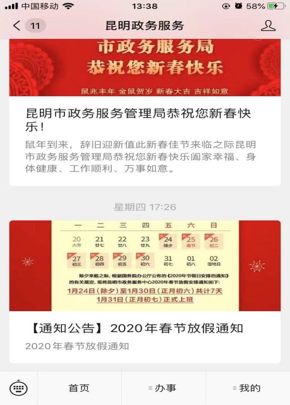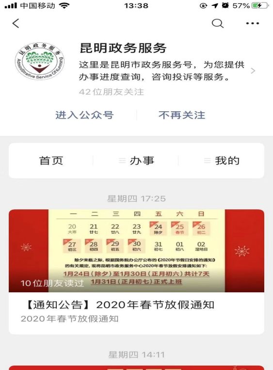 1.查找微信公众号“昆明政务服务”,并关注微信公众号。