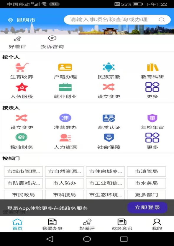 1.应用商城下载安装“昆明政务大厅”或扫描二维码下载手机App。