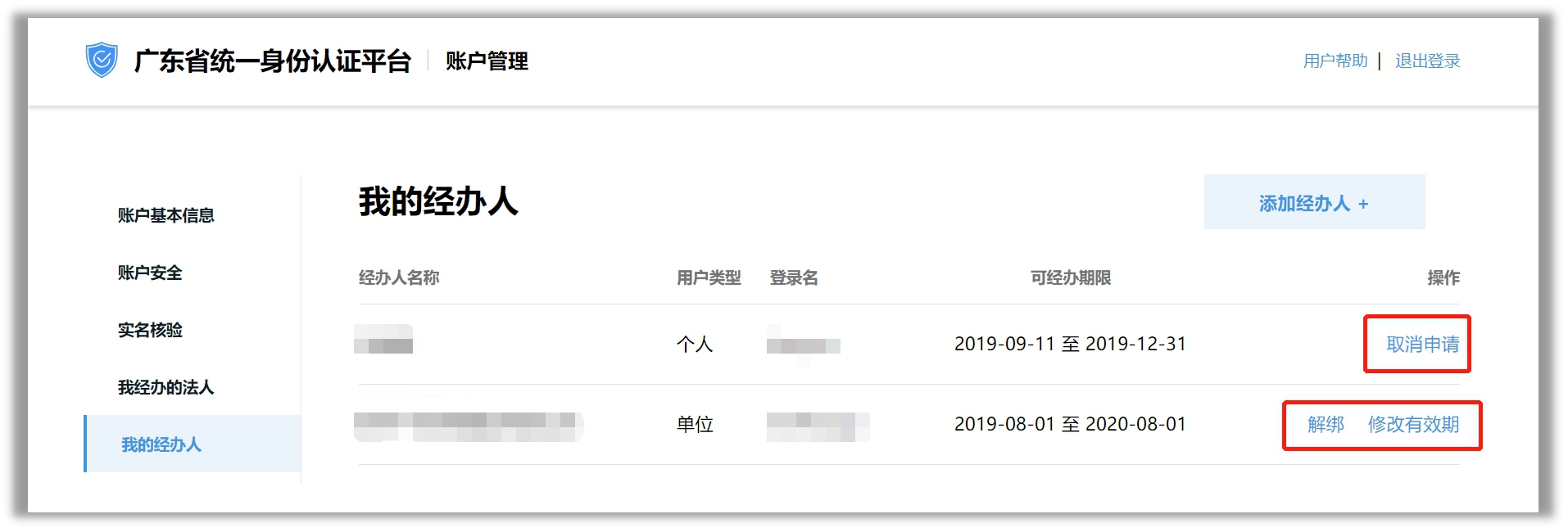 在账户管理页的我经办的法人栏,进行经办的企业的管理。对于未绑定的企业账号,可选择“绑定”或“不绑定”;对于已绑定的企业账号,可选择“解绑”,解绑之后不再显示此用户信息