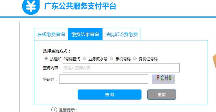②在“缴费结果查询”页输入对应的查询内容,以及填写对应的验证码,点击“查询”按钮后查询缴费结果。