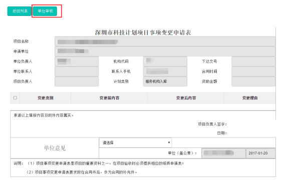 6. 单位管理员确定后,点“单位审核”,提交变更申请至市科创委,完成后续变更流程。