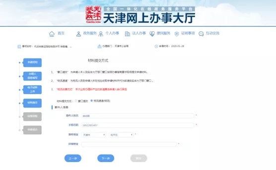 可选择“窗口提交”和“物流速递(物流)”,其中“物流速递(物流)”,需要填写详细地址,疫情期间请选择“物流速递(物流)”。(注:选择此项业务所产生的寄送费用由用户自行承担。)。
