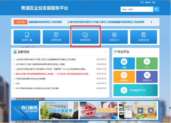 步骤一:登录网站后点击“政策咨询”按钮。